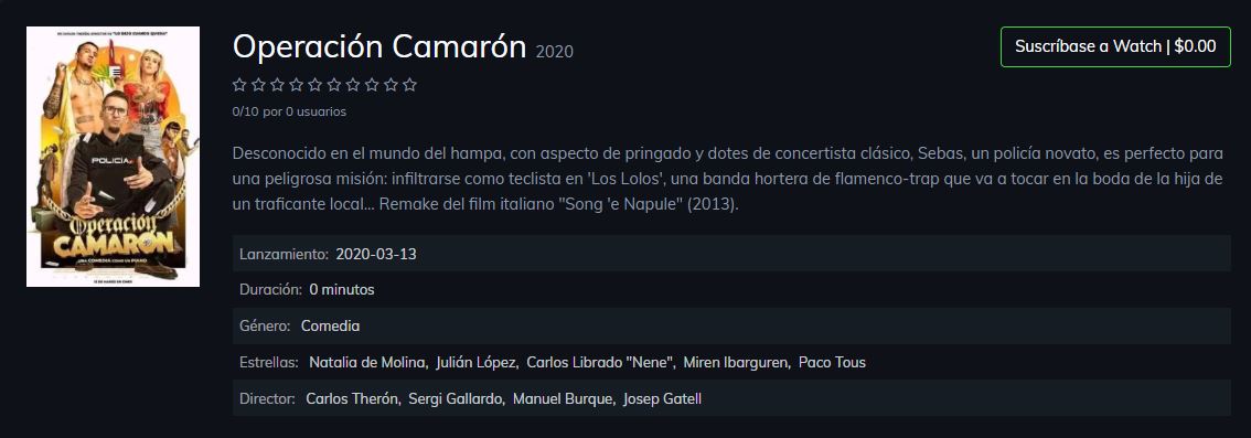 Disfruta películas y programas en Internet o en tu Smart TV, consola de videojuegos, PC, Mac, dispositivo móvil, tableta. Ver y Descargar Películas online gratis de audio latino Estrenos y todo tipo de peliculas completamente gratis , español y sin cortes en calidad HD. Ver Gratis Operacion Camaron ver películas con subtítulos en español gratis, Ver Gratis Operacion Camaron ver la película completa en el mejor formato de video desde cualquier dispositivo Dirigida por Carlos Therón Reparto Julián López, Natalia de Molina, Miren Ibarguren.